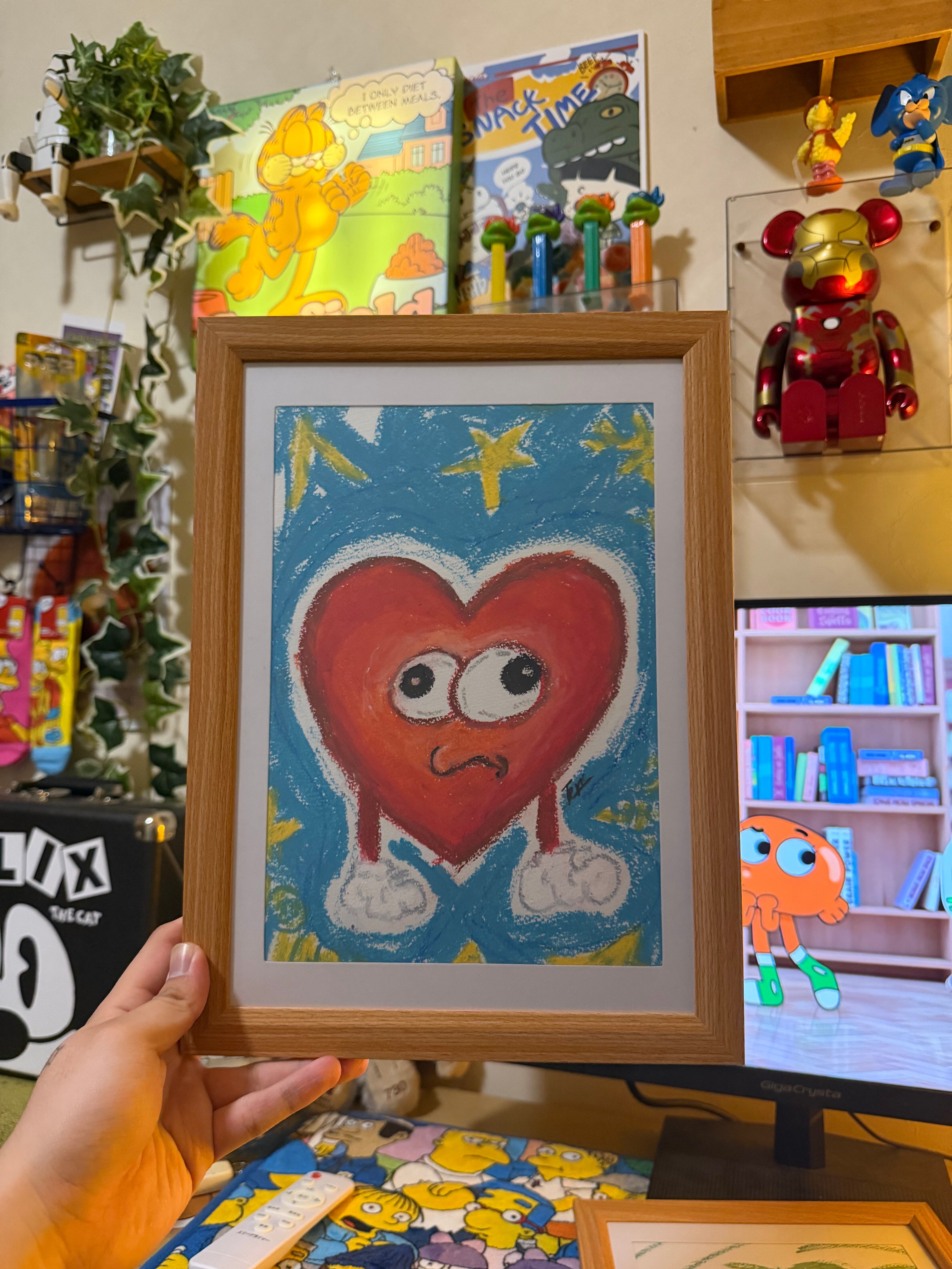 少し不安そうな表情をした、小さなハートのキャラクターを描いた原画作品です。